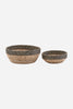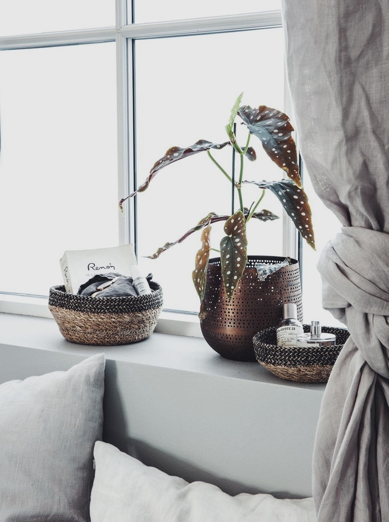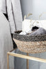 Handy seagrass and jute baskets, featuring a black detail to their upper part which looks like a patterned ribbon.