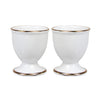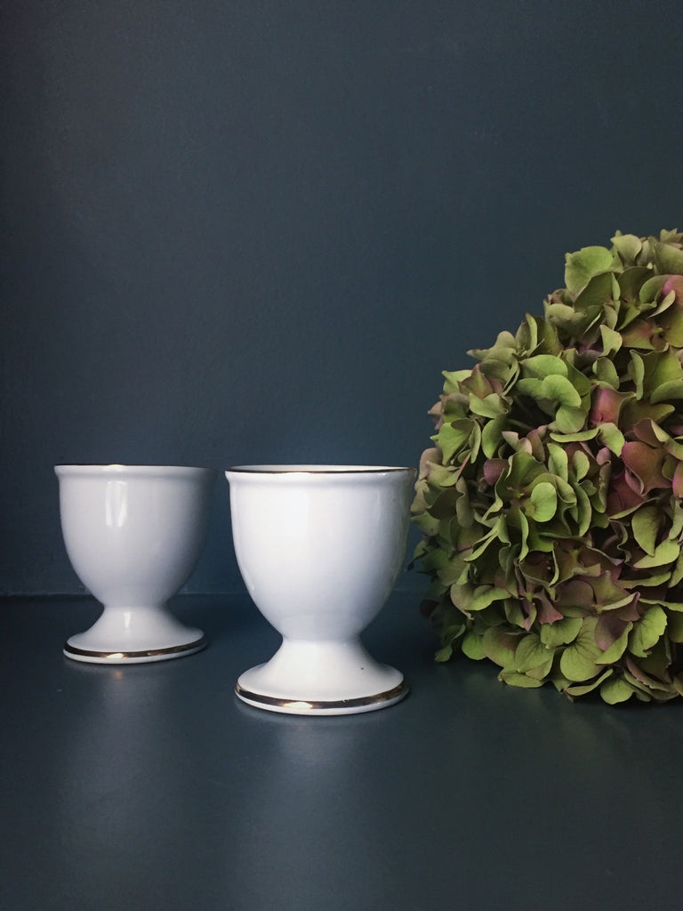 Super sweet white porcelain egg cups with a gorgeous shiny gold band to brighten up your breakfast table.