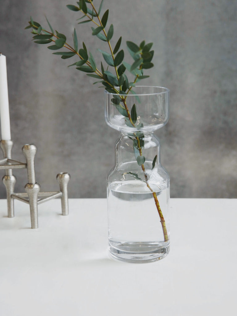 Tall clear glass vase in an elegant shape with a rounded, soft outline - a classic piece that will work in many places and never go out of style.