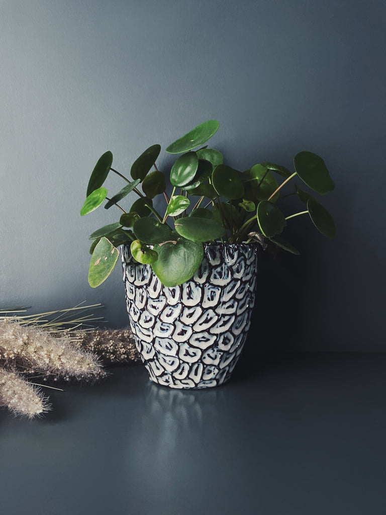 Beautifully tactile dark blue and white stoneware planter. We love the tactile nature of this piece and it's the perfect size for small to medium house plants.