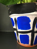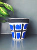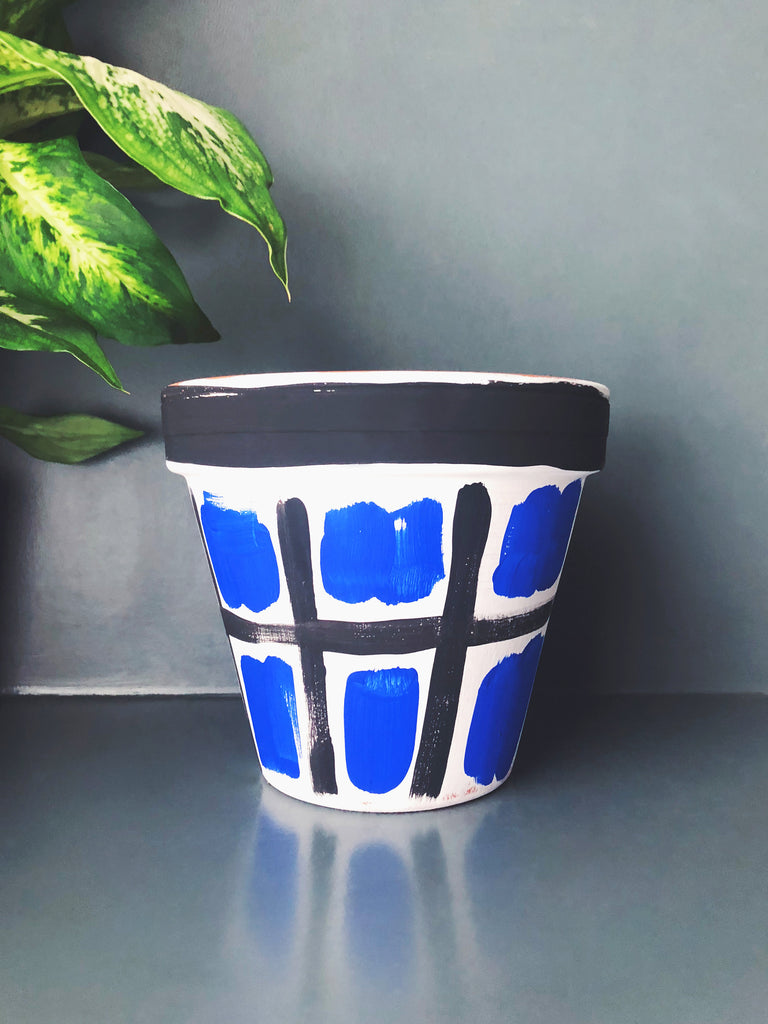 'WHO BY FIRE' hand painted terracotta plant pot, featuring a black and white matt white grid background with blue brushstrokes